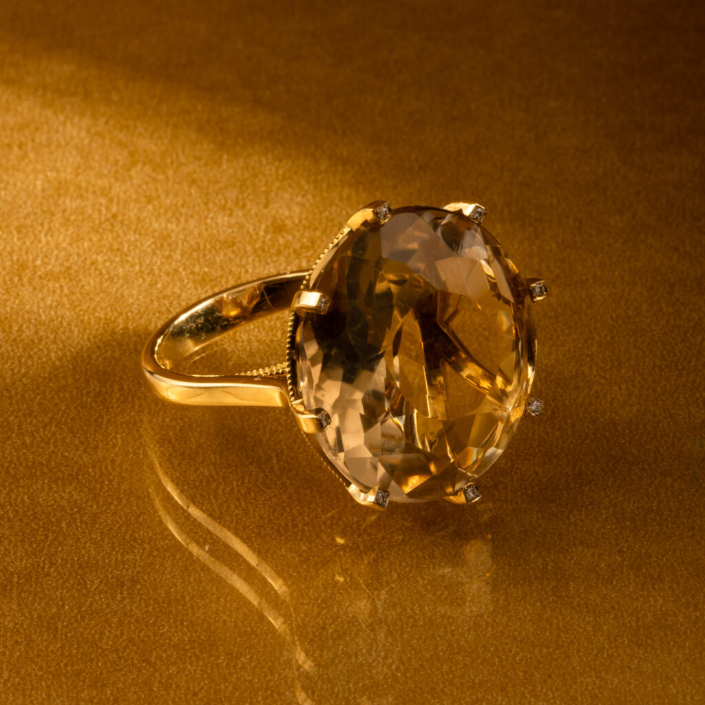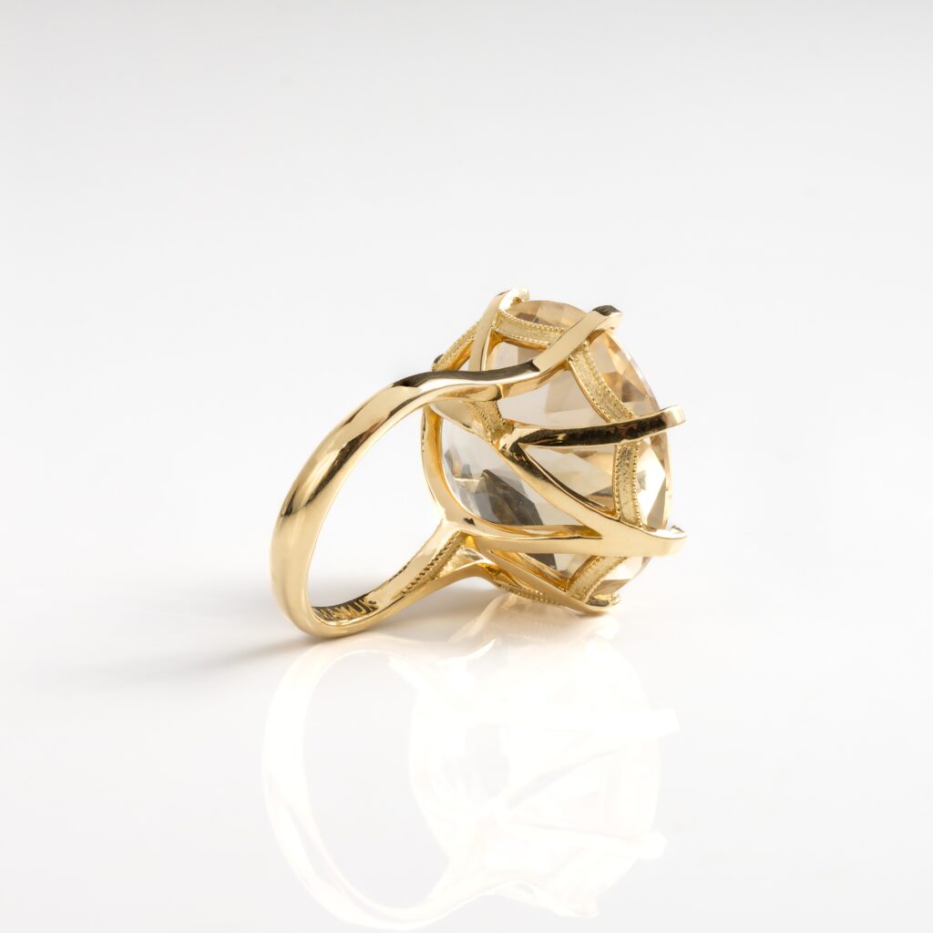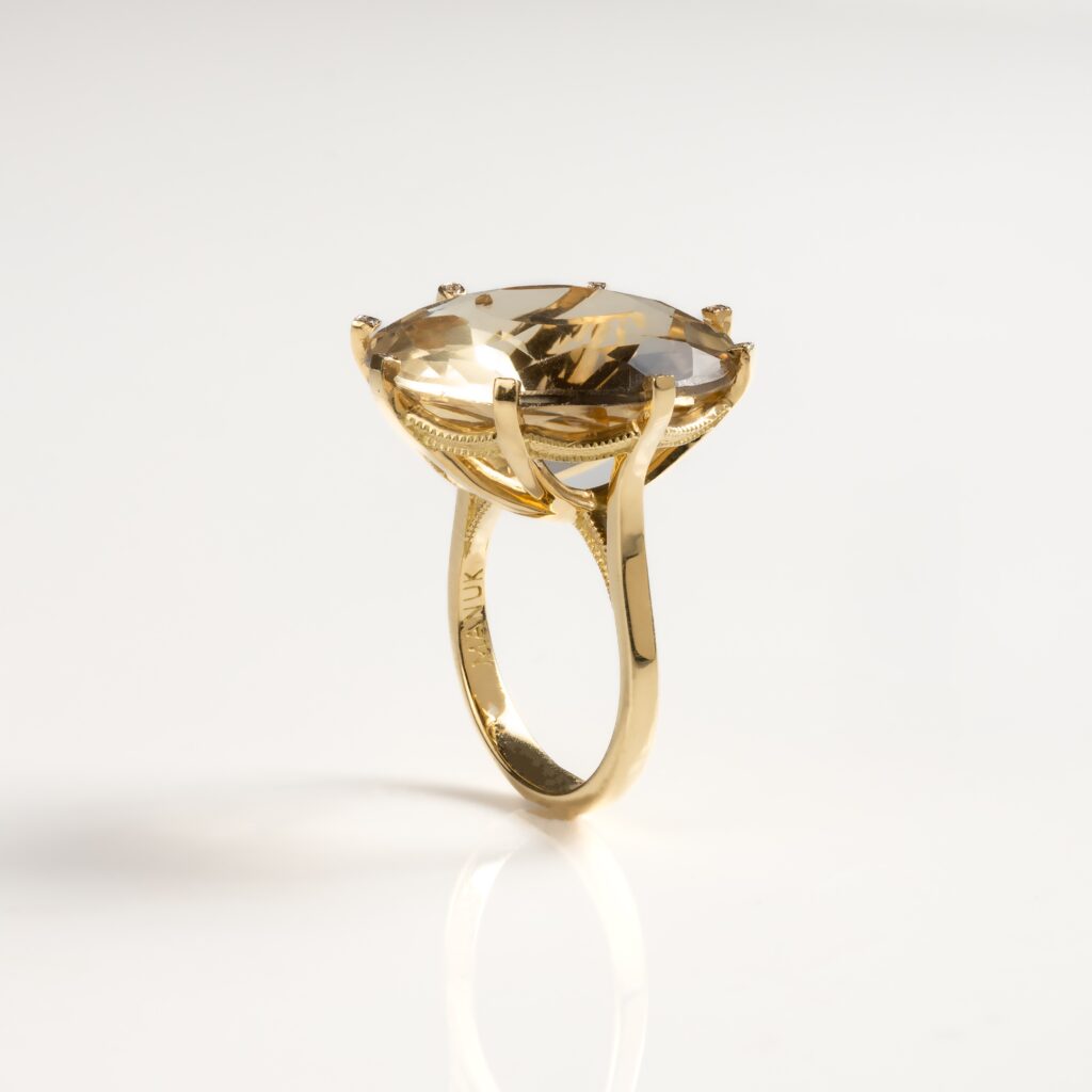 Expertos talladores de gemas han logrado este magnífico Topacio fumé, con una tonalidad y facetado excepcional que deslumbra con cada destello. El anillo Yeva está realizado en Oro 18k y decorado con un minucioso trabajo de milgrif.